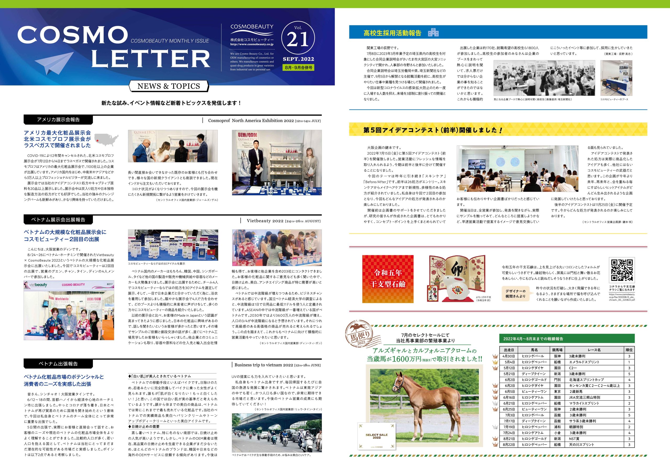 News TOP › Cosmo Letter › COSMO LETTER Vol.21 【Aug–Sep 2022 Combined Issue】 COSMO LETTER Vol.21 【Aug–Sep 2022 Combined Issue】 2022/09/01 Category Events Cosmo Letter Media Coverage NEWS Archive September 2025 (3) June 2025 (1) March 2025 (1) January 2025 (2) October 2024 (1) June 2024 (1) March 2024 (1) January 2024 (1) November 2023 (1) September 2023 (1) July 2023 (1) May 2023 (1) March 2023 (1) January 2023 (1) November 2022 (1) September 2022 (1) July 2022 (1) May 2022 (1) March 2022 (1) January 2022 (2) November 2021 (1) September 2021 (1) July 2021 (1) May 2021 (1) March 2021 (1) January 2021 (1) November 2020 (1) September 2020 (1) July 2020 (1) May 2020 (1) March 2020 (1) January 2020 (1) November 2019 (1) September 2019 (1) July 2019 (1) May 2019 (1) View All Archives Recommended Articles / Featured Articles
