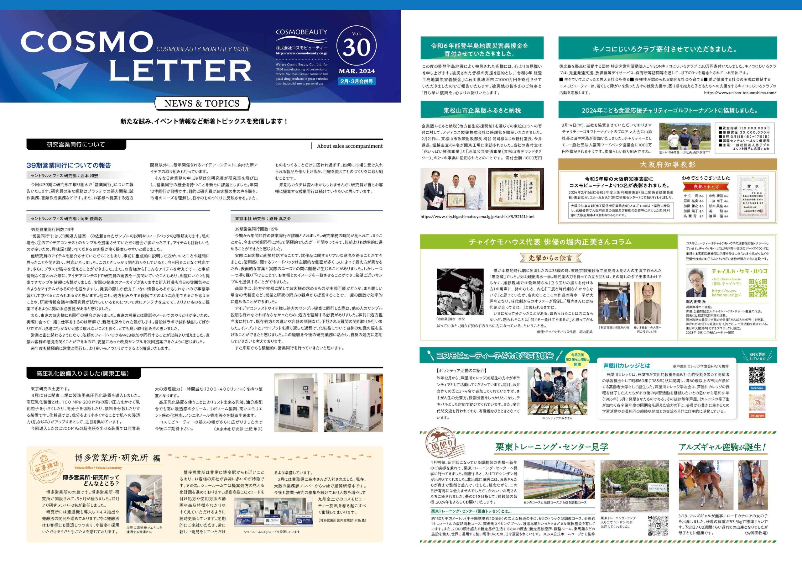 News TOP › Cosmo Letter › COSMO LETTER Vol.30 【Feb–Mar 2024 Combined Issue】 COSMO LETTER Vol.30 【Feb–Mar 2024 Combined Issue】 2024/03/01 Category Events Cosmo Letter Media Coverage NEWS Archive September 2025 (3) June 2025 (1) March 2025 (1) January 2025 (2) October 2024 (1) June 2024 (1) March 2024 (1) January 2024 (1) November 2023 (1) September 2023 (1) July 2023 (1) May 2023 (1) March 2023 (1) January 2023 (1) November 2022 (1) September 2022 (1) July 2022 (1) May 2022 (1) March 2022 (1) January 2022 (2) November 2021 (1) September 2021 (1) July 2021 (1) May 2021 (1) March 2021 (1) January 2021 (1) November 2020 (1) September 2020 (1) July 2020 (1) May 2020 (1) March 2020 (1) January 2020 (1) November 2019 (1) September 2019 (1) July 2019 (1) May 2019 (1) View All Archives Recommended Articles / Featured Articles