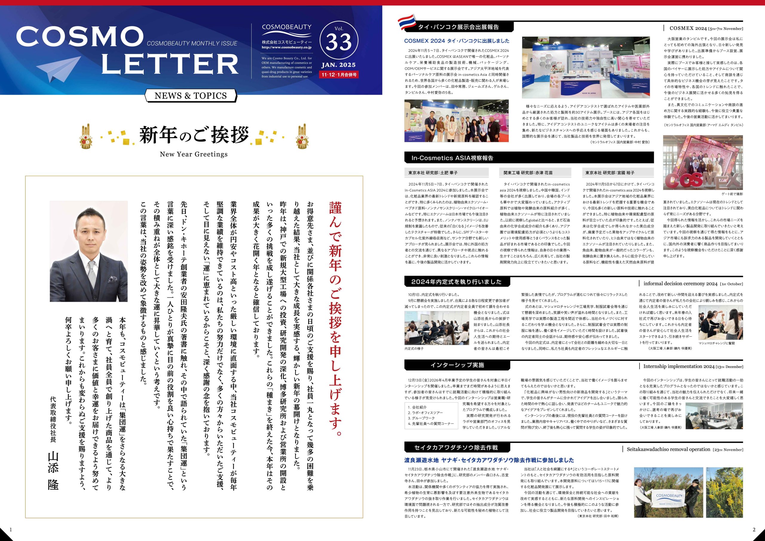 News TOP › Cosmo Letter › COSMO LETTER Vol.33 【Nov–Dec 2024 / Jan 2025 Combined Issue】 COSMO LETTER Vol.33 【Nov–Dec 2024 / Jan 2025 Combined Issue】 2025/01/01 Category Events Cosmo Letter Media Coverage NEWS Archive September 2025 (3) June 2025 (1) March 2025 (1) January 2025 (2) October 2024 (1) June 2024 (1) March 2024 (1) January 2024 (1) November 2023 (1) September 2023 (1) July 2023 (1) May 2023 (1) March 2023 (1) January 2023 (1) November 2022 (1) September 2022 (1) July 2022 (1) May 2022 (1) March 2022 (1) January 2022 (2) November 2021 (1) September 2021 (1) July 2021 (1) May 2021 (1) March 2021 (1) January 2021 (1) November 2020 (1) September 2020 (1) July 2020 (1) May 2020 (1) March 2020 (1) January 2020 (1) November 2019 (1) September 2019 (1) July 2019 (1) May 2019 (1) View All Archives Recommended Articles / Featured Articles