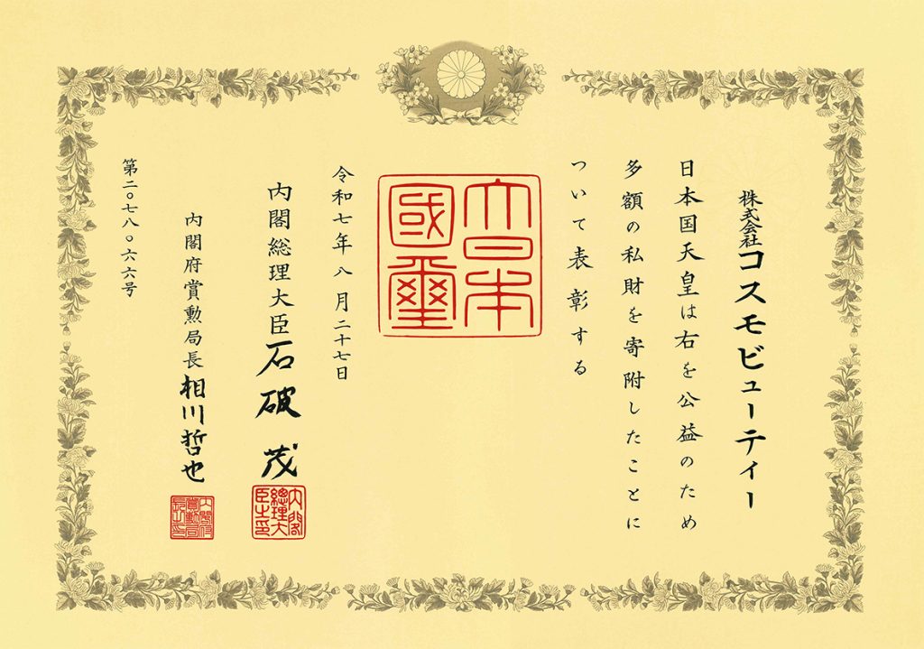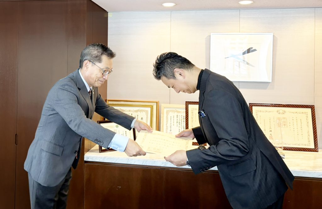 We are honored to have received the “Medal with Dark Blue Ribbon (Certificate of Commendation)” from the Cabinet Office of Japan, presented by Mayor Irie of Jinsekikōgen Town, Hiroshima Prefecture, in recognition of our corporate hometown tax donation achievements.