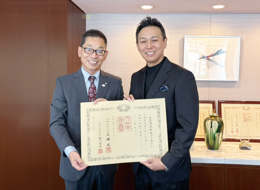TOP NEWS We are honored to have received the “Medal with Dark Blue Ribbon (Certificate of Commendation)” from the Cabinet Office of Japan, presented by Mayor Irie of Jinsekikōgen Town, Hiroshima Prefecture, in recognition of our corporate hometown tax donation achievements.