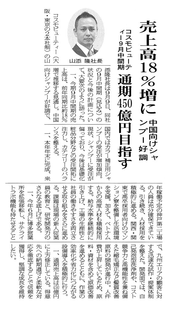 News TOP › Media Coverage › Featured in “Aerosol & OEM Industrial Newspaper.” Featured in “Aerosol & OEM Industrial Newspaper.” 2025/09/15 Category Events Cosmo Letter Media Coverage NEWS Archive September 2025 (3) June 2025 (1) March 2025 (1) January 2025 (2) October 2024 (1) June 2024 (1) March 2024 (1) January 2024 (1) November 2023 (1) September 2023 (1) July 2023 (1) May 2023 (1) March 2023 (1) January 2023 (1) November 2022 (1) September 2022 (1) July 2022 (1) May 2022 (1) March 2022 (1) January 2022 (2) November 2021 (1) September 2021 (1) July 2021 (1) May 2021 (1) March 2021 (1) January 2021 (1) November 2020 (1) September 2020 (1) July 2020 (1) May 2020 (1) March 2020 (1) January 2020 (1) November 2019 (1) September 2019 (1) July 2019 (1) May 2019 (1) View All Archives Recommended Articles / Featured Articles
