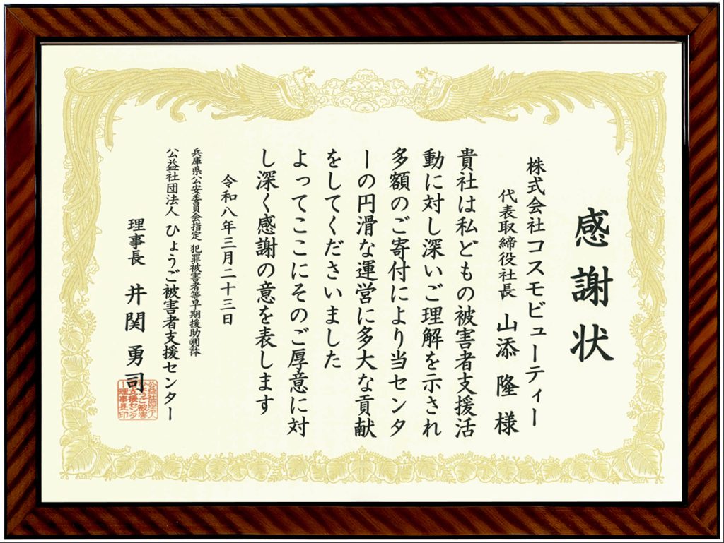 公益社団法人ひょうご被害者支援センターへ寄附し、感謝状を賜りました。