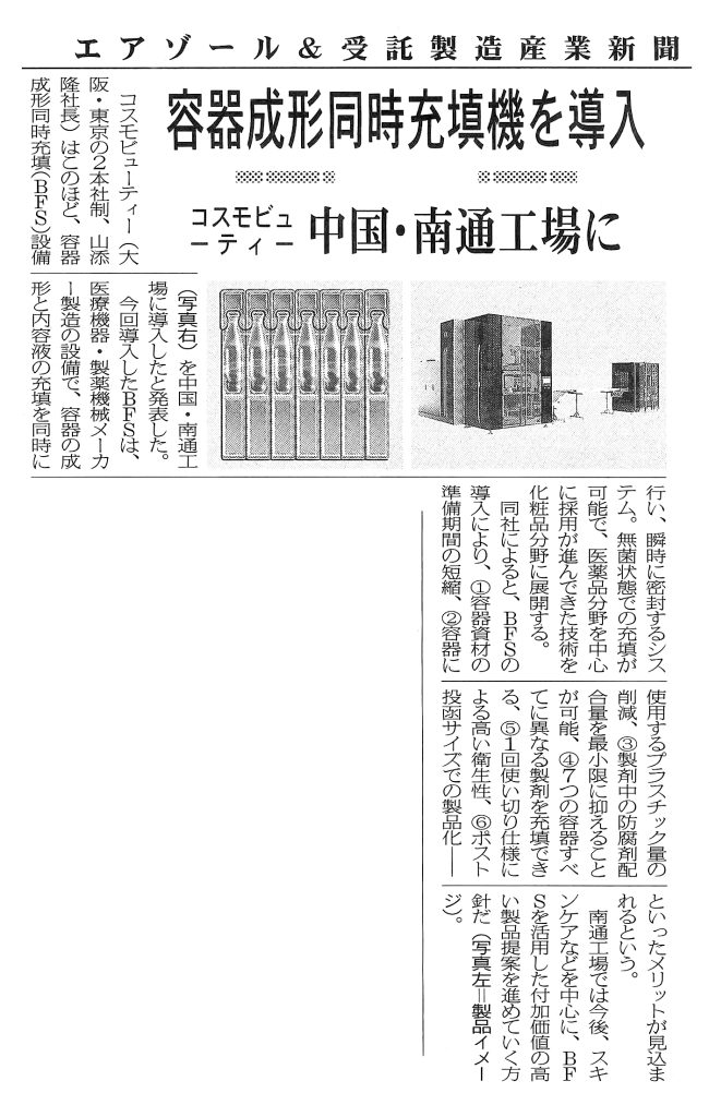 Newsお知らせ TOP › 掲載情報 › 「エアゾール&受託製造産業新聞」に記事が掲載されました。 「エアゾール&受託製造産業新聞」に記事が掲載されました。 2026/02/25 カテゴリー お知らせ イベント コスモレター 掲載情報 アーカイブ 2026年2月 (1) 2026年1月 (2) 2025年12月 (2) 2025年10月 (1) 2025年9月 (3) 2025年8月 (1) 2025年6月 (3) 2025年5月 (2) 2025年3月 (7) 2025年2月 (1) 2025年1月 (2) 2024年10月 (1) 2024年6月 (1) 2024年3月 (1) 2024年1月 (1) 2023年11月 (1) 2023年9月 (1) 2023年7月 (1) 2023年5月 (1) 2023年3月 (1) 2023年1月 (1) 2022年11月 (1) 2022年9月 (1) 2022年7月 (1) 2022年5月 (1) 2022年3月 (1) 2022年1月 (2) 2021年11月 (1) 2021年9月 (1) 2021年7月 (1) 2021年5月 (1) 2021年3月 (1) 2021年1月 (1) 2020年11月 (1) 2020年9月 (1) 2020年7月 (1) 2020年5月 (1) 2020年3月 (1) 2020年1月 (1) 2019年11月 (1) 2019年9月 (1) 2019年7月 (1) 2019年5月 (1) アーカイブを全て表示 おすすめ記事