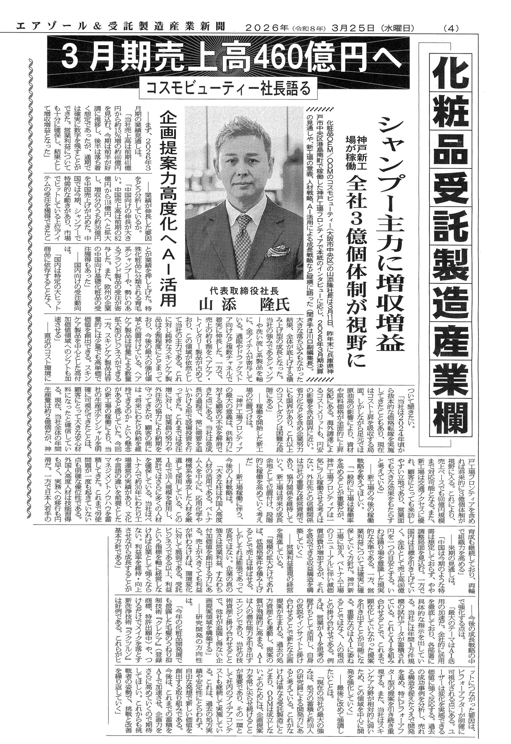 Newsお知らせ TOP › 掲載情報 › 「エアゾール&受託製造産業新聞」に記事が掲載されました。 「エアゾール&受託製造産業新聞」に記事が掲載されました。 2026/03/25 カテゴリー お知らせ イベント コスモレター 掲載情報 アーカイブ 2026年3月 (3) 2026年2月 (1) 2026年1月 (3) 2025年12月 (2) 2025年10月 (1) 2025年9月 (3) 2025年8月 (1) 2025年6月 (3) 2025年5月 (2) 2025年3月 (7) 2025年2月 (1) 2025年1月 (2) 2024年10月 (1) 2024年6月 (1) 2024年3月 (1) 2024年1月 (1) 2023年11月 (1) 2023年9月 (1) 2023年7月 (1) 2023年5月 (1) 2023年3月 (1) 2023年1月 (1) 2022年11月 (1) 2022年9月 (1) 2022年7月 (1) 2022年5月 (1) 2022年3月 (1) 2022年1月 (2) 2021年11月 (1) 2021年9月 (1) 2021年7月 (1) 2021年5月 (1) 2021年3月 (1) 2021年1月 (1) 2020年11月 (1) 2020年9月 (1) 2020年7月 (1) 2020年5月 (1) 2020年3月 (1) 2020年1月 (1) 2019年11月 (1) 2019年9月 (1) 2019年7月 (1) 2019年5月 (1) アーカイブを全て表示 おすすめ記事